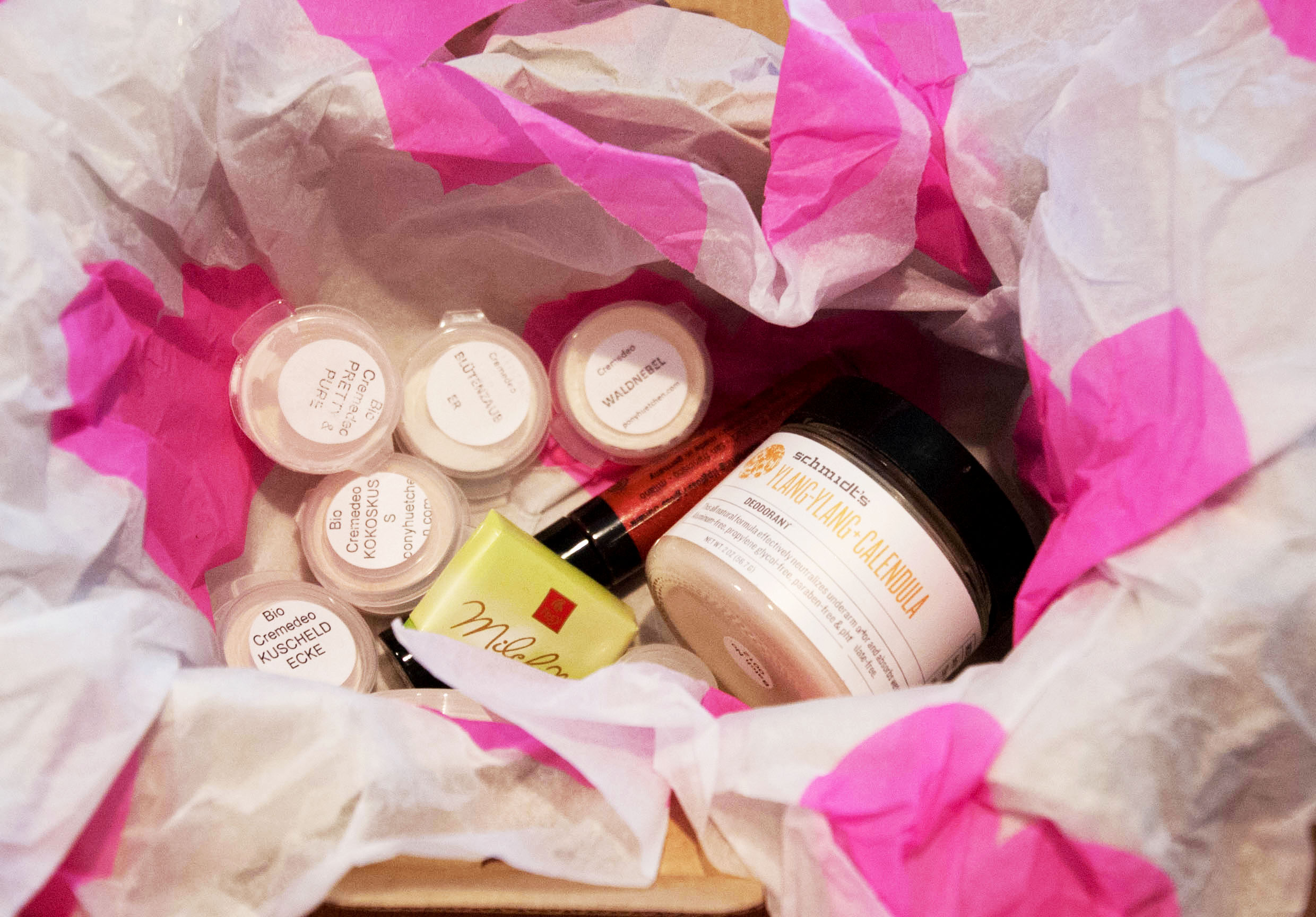 Ich habe mich besonders gefreut, endlich die in Bloggerkreisen bereits bekannten Deocremes von Ponyhütchen zu testen. Nachdem die Wolkenseifen Deocremes bei mir zwar den ganzen Tag über gut gehalten haben, hat mich doch das Weisseln auf dunkler Kleidung sehr gestört. Nun versuche ich mein Glück mit sechs kleinen Pröbchen in den Duftrichtungen: Waldnebel, Kuscheldecke, Kokosnuss, Honigschnütchen, Blütenzauber und Pretty&Pure (ohne Duftstoffe). Den Pröbchen-Service bei Ponyhütchen finde ich super. Für 1,90 € kann man sich eine 5 ml-Probe in allen möglichen Duftrichtungen bestellen. So kann man Probeschnuppern und entscheiden, welcher Duft einem am ehesten zusagt. Für meinen Mann gab es auch eine 25 ml Deocreme in der Duftrichtung „Erlkönig“ zum Ausprobieren. Eine kleine Schweizer Schocki gab es obendrauf 🙂