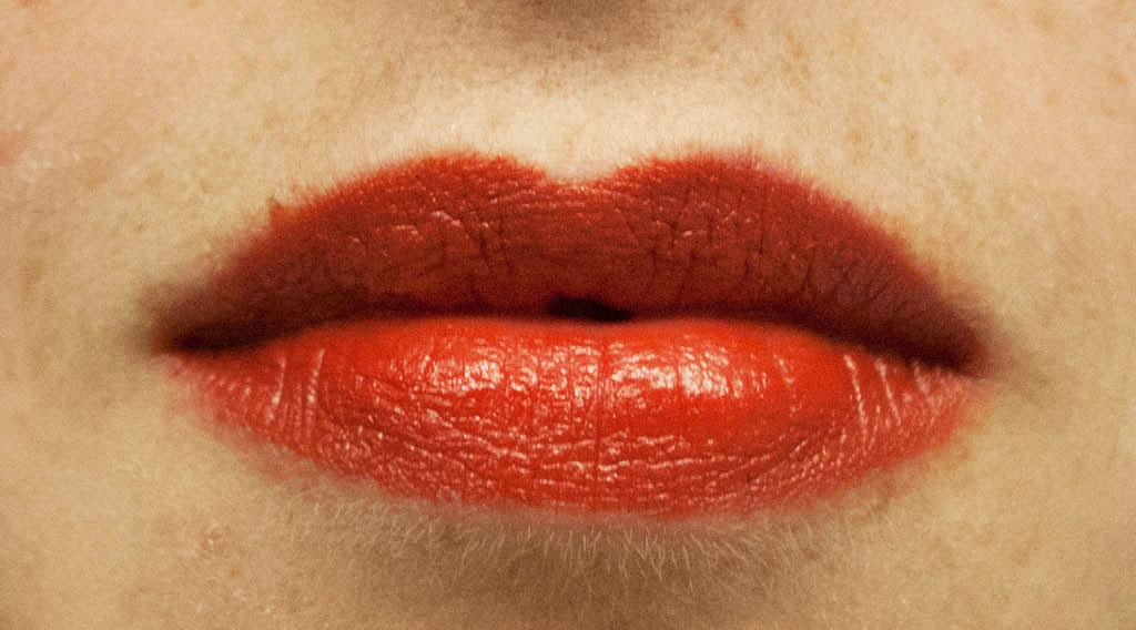 Rockabella Red ist ein warmes Orangerrot mit einem cremigen und leicht glossigen Finish. Ich habe vor dem Auftragen einen Lipliner verwendet – den Benecos Lipliner in brown. Dieser kommt sehr nahe an meine eigentliche Lippenfarbe heran. Das Auftragen ist sehr einfach durch die cremige Konsistenz. Der Lippenstift ist meiner Meinung nach gut pigmentiert und ist vom Erscheinungsbild eher auffällig.