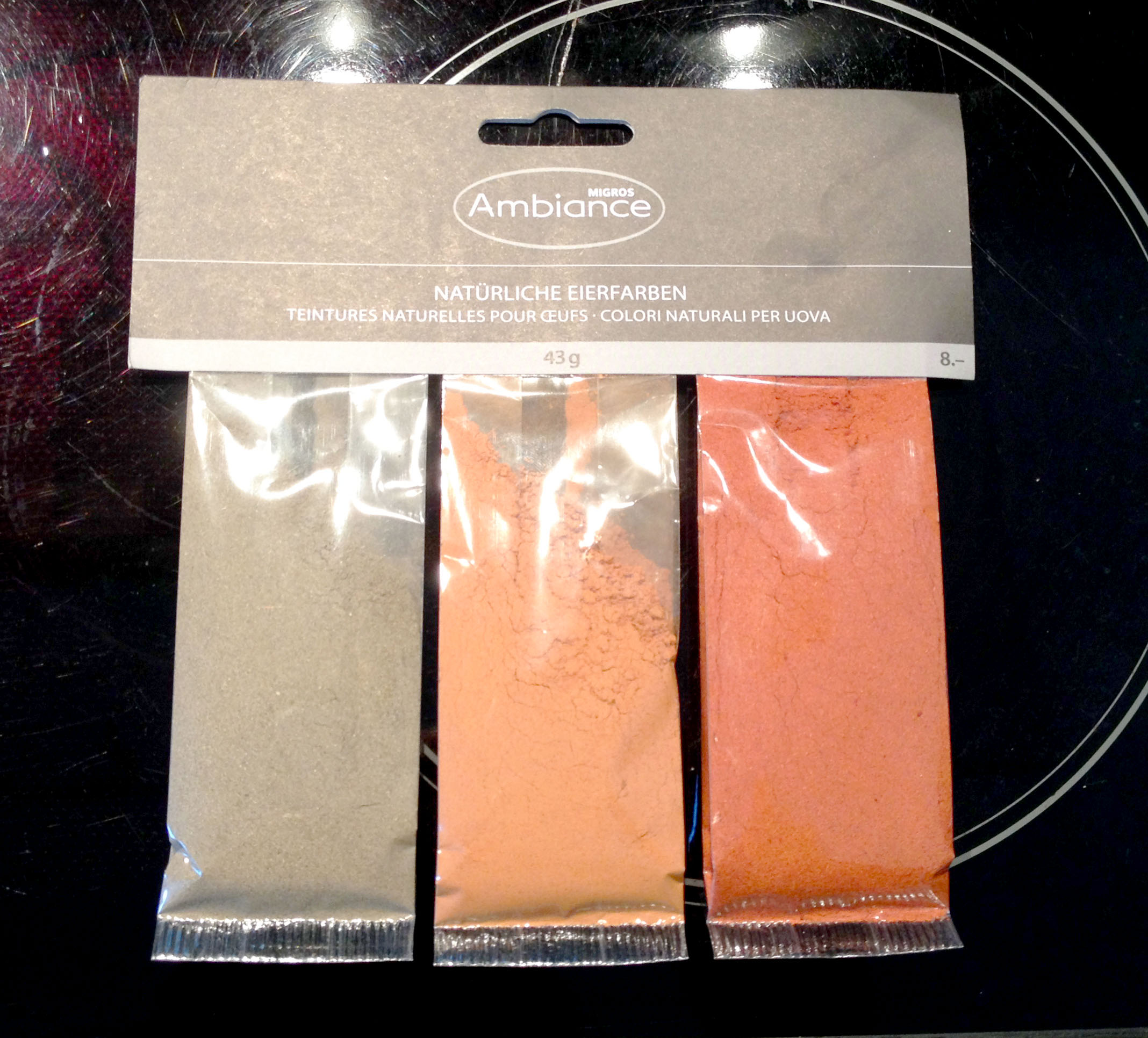 Die natürlichen Eierfarben habe ich im Migros gekauft (Schweizer Supermarkt). Das Set enthält drei Farben mit 43 g für 8,00 CHF (momentan ca. 7,50 €).
